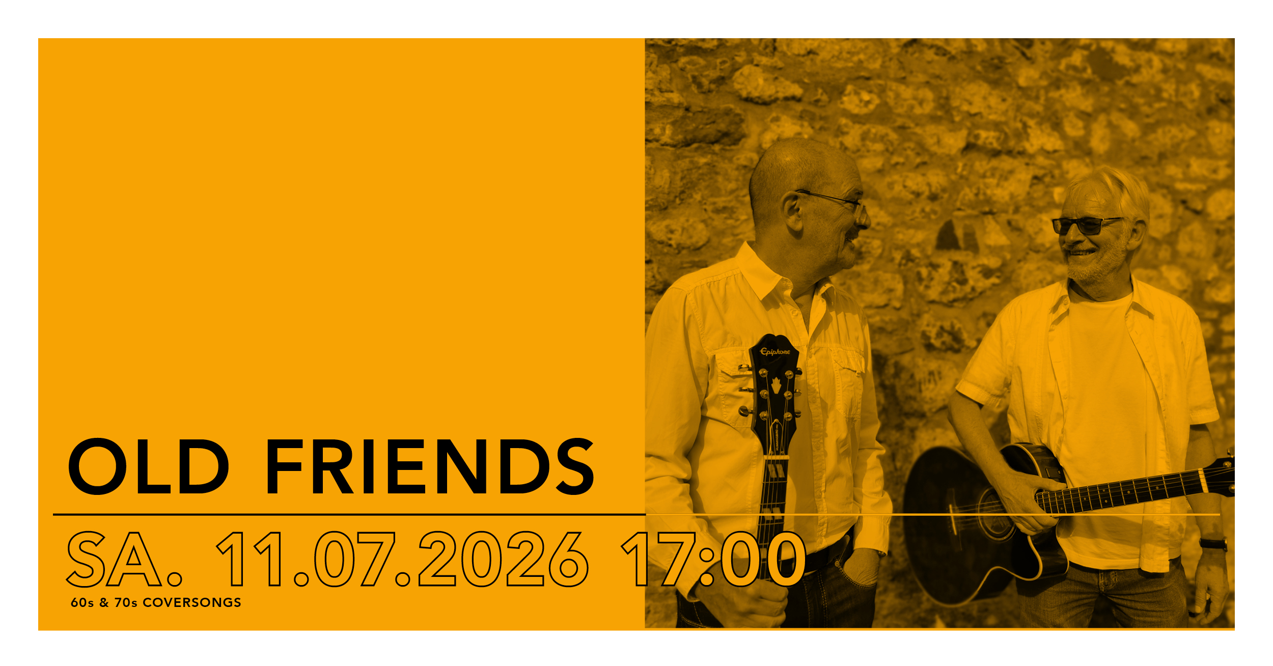 Die Musiker des Duos „Old Friends“ sind mit diesen Songs aufgewachsen. Nach vielen Jahren bei den legendären PÖMS, Auftritten mit Stars wie Suzi Quatro, den Troggs und vielen anderen suchen Georg Decker und Volker Lieb mit ihren Akustik-Gitarren nun den engen Kontakt zum Publikum – der Sound der „Sixties“ und „Seventies“ pur!